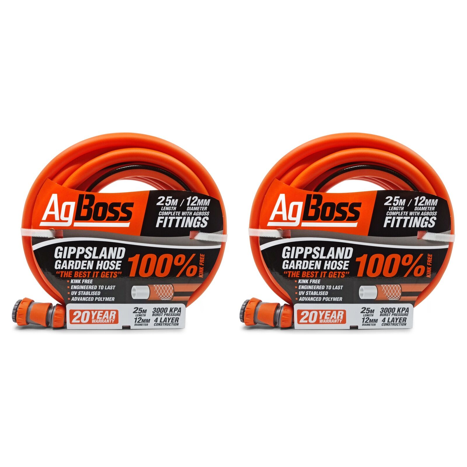 Experience a truly frustration-free watering experience with the AgBoss 12mm x 25m Gippsland Premium Garden Hose, available at The Grit. This is not just another hose; it is engineered with a unique combination of advanced polymers and a special 4-layer construction to be genuinely 100% kink-free, saving you from the constant battle of untangling and straightening. Built to endure the harsh Australian climate, its outer wall is fully UV stabilised to resist cracking and fading in the sun, and it is also highly frost resistant for reliable performance on those chilly mornings. With an impressive burst pressure of 3000 kPa, this hose is exceptionally durable and designed for long-lasting service in any home garden or worksite. This 25-metre length comes complete with quality fittings, so it is ready for immediate use. For a premium, hassle-free watering solution that is built to last, look no further than this innovative hose from The Grit.