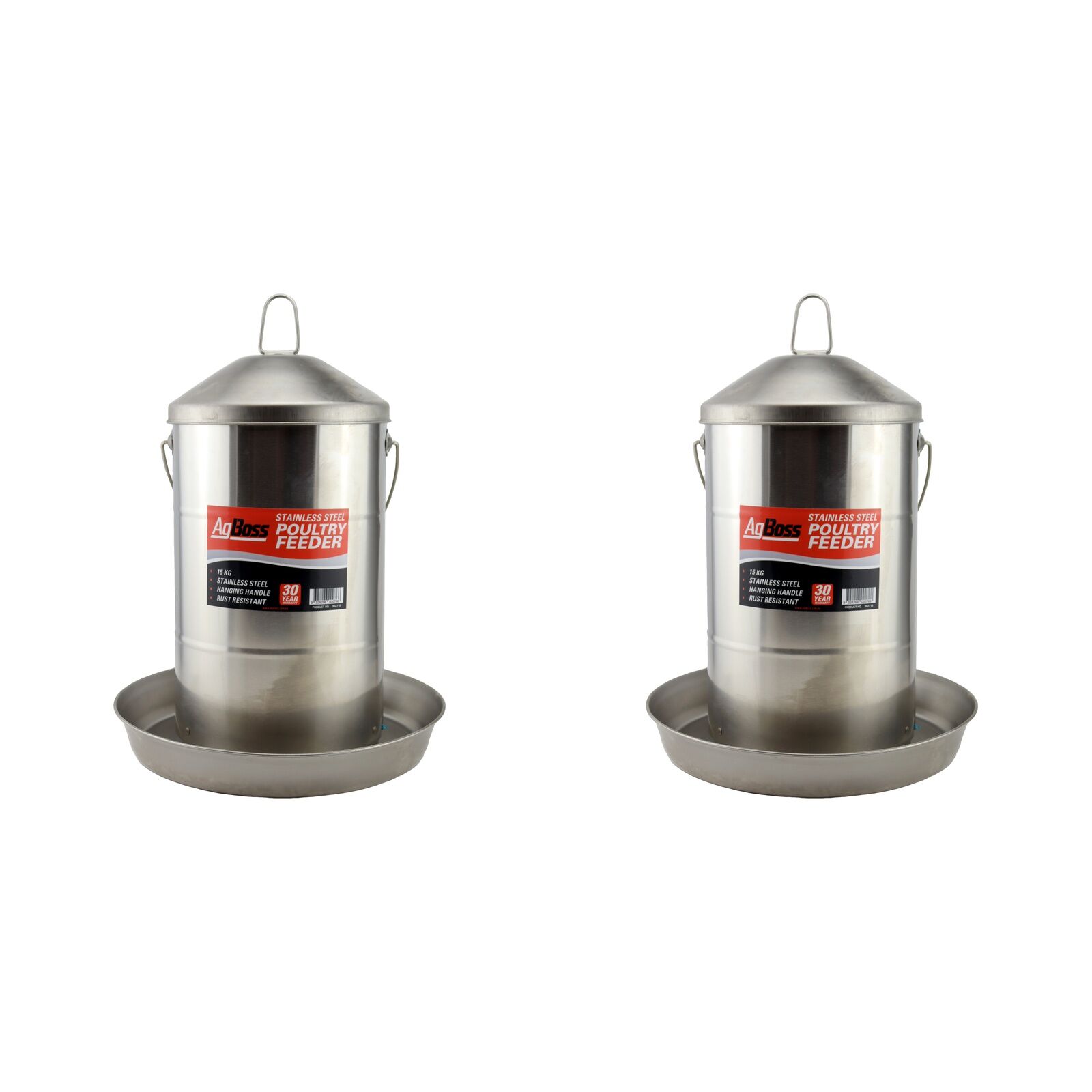 Robust, top-quality, stainless poultry feeder with hanging handle from AgBoss. Made of stainless steel for extra-long life and durability. Includes a handle for hanging.