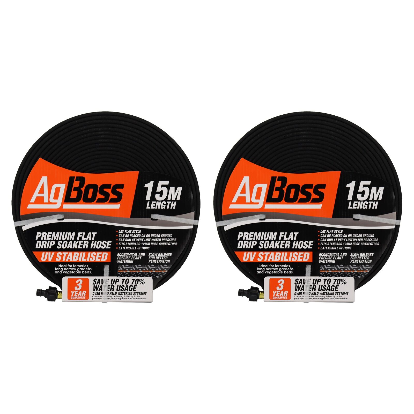 This Premium Flat Drip Soaker Hose from AgBoss is ideal for providing constant and consistent water to ferneries, long narrow gardens, and vegetable beds. It uses up to 70% less water than hand held watering systems, it conserves water by delivering it directly to plants root system; reducing runoff and evaporation.