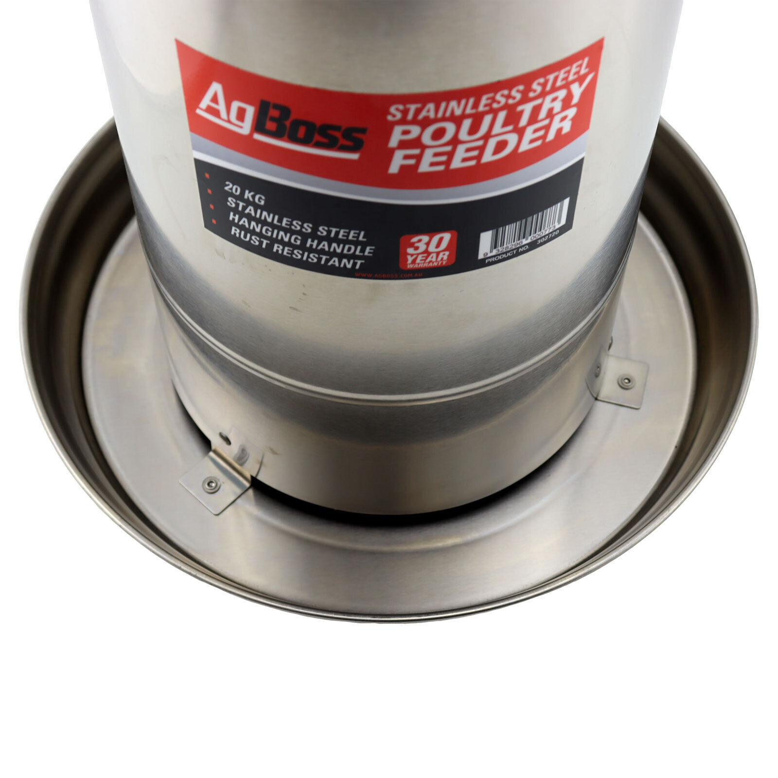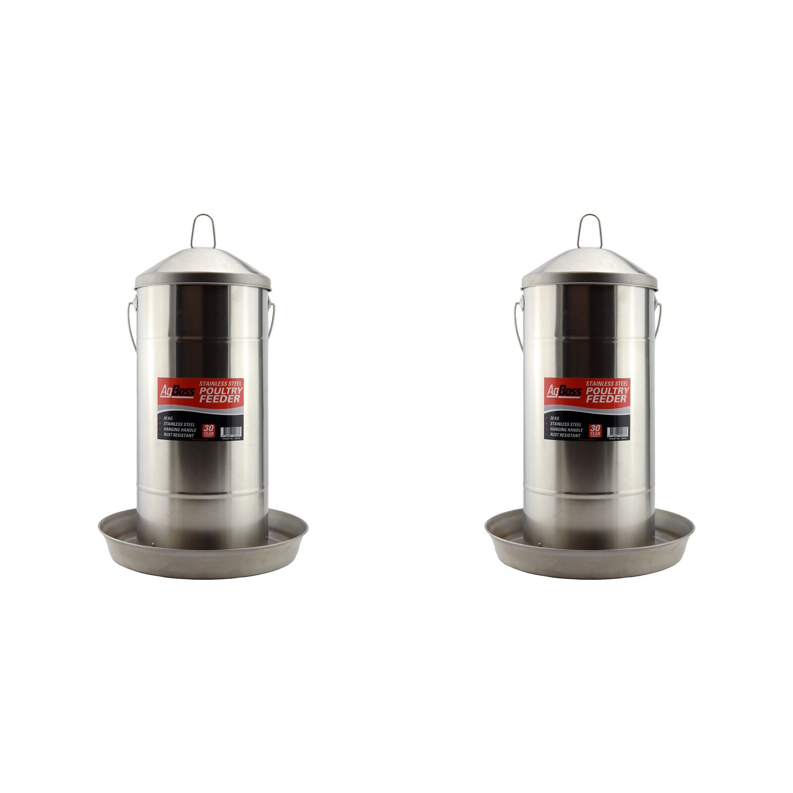 Robust, top-quality, stainless poultry feeder with hanging handle from AgBoss. Made of stainless steel for extra-long life and durability. Includes a handle for hanging.