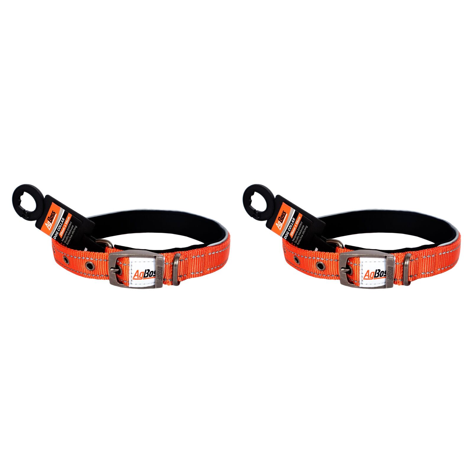 Introducing the AgBoss Orange Dog Collar, a reliable and durable collar designed to keep your furry friend safe and comfortable during walks or outdoor activities. Made with high-quality materials, this collar is built to withstand wear and tear, making it a perfect choice for active dogs. The AgBoss Orange Dog Collar features a 25mm width and 45cm length, providing a secure fit for medium to large breeds. The collar is made of tough, weather-resistant nylon webbing that is easy to clean and maintain. The bright orange color ensures that your dog will be visible in low-light conditions, enhancing their safety during outdoor adventures. This collar is also equipped with a sturdy metal buckle and D-ring, providing a reliable attachment point for leashes and identification tags. The buckle is designed to be quick and easy to fasten, allowing you to get your dog ready for their walk in no time. The D-ring is welded for extra strength, ensuring that it will hold up to regular use. Whether you're taking your dog on a long hike or just a quick walk around the block, the AgBoss Orange Dog Collar is a reliable choice for keeping your pet safe and comfortable. Order now and give your furry friend the high-quality collar they deserve! The NEW Agboss range of working dog collars and leads is more comfortable for your best friend and you. The all day reflective stitching will make your dog easily visible day and night. Available in Orange, Black & HOT PINK in different sizes to accommodate several types of pets.