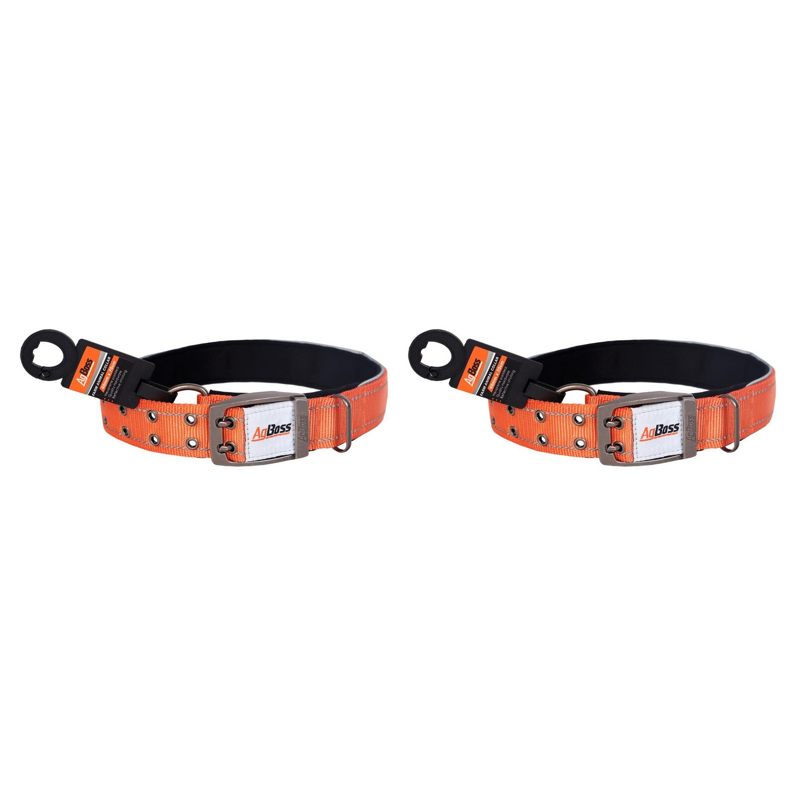Introducing the AgBoss Orange Dog Collar, a reliable and durable collar designed to keep your furry friend safe and comfortable during walks or outdoor activities. Made with high-quality materials, this collar is built to withstand wear and tear, making it a perfect choice for active dogs. The AgBoss Orange Dog Collar features a 25mm width and 45cm length, providing a secure fit for medium to large breeds. The collar is made of tough, weather-resistant nylon webbing that is easy to clean and maintain. The bright orange color ensures that your dog will be visible in low-light conditions, enhancing their safety during outdoor adventures. This collar is also equipped with a sturdy metal buckle and D-ring, providing a reliable attachment point for leashes and identification tags. The buckle is designed to be quick and easy to fasten, allowing you to get your dog ready for their walk in no time. The D-ring is welded for extra strength, ensuring that it will hold up to regular use. Whether you're taking your dog on a long hike or just a quick walk around the block, the AgBoss Orange Dog Collar is a reliable choice for keeping your pet safe and comfortable. Order now and give your furry friend the high-quality collar they deserve! The NEW Agboss range of working dog collars and leads is more comfortable for your best friend and you. The all day reflective stitching will make your dog easily visible day and night. Available in Orange, Black & HOT PINK in different sizes to accommodate several types of pets.