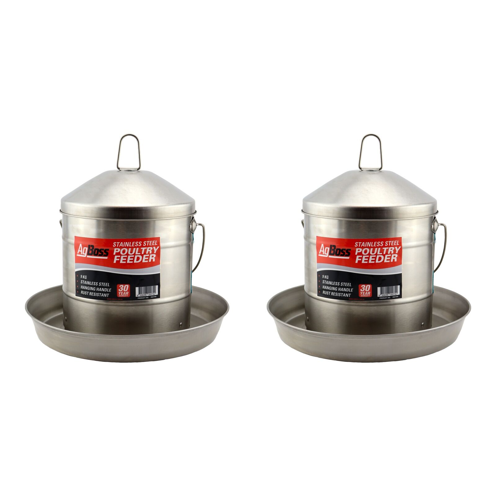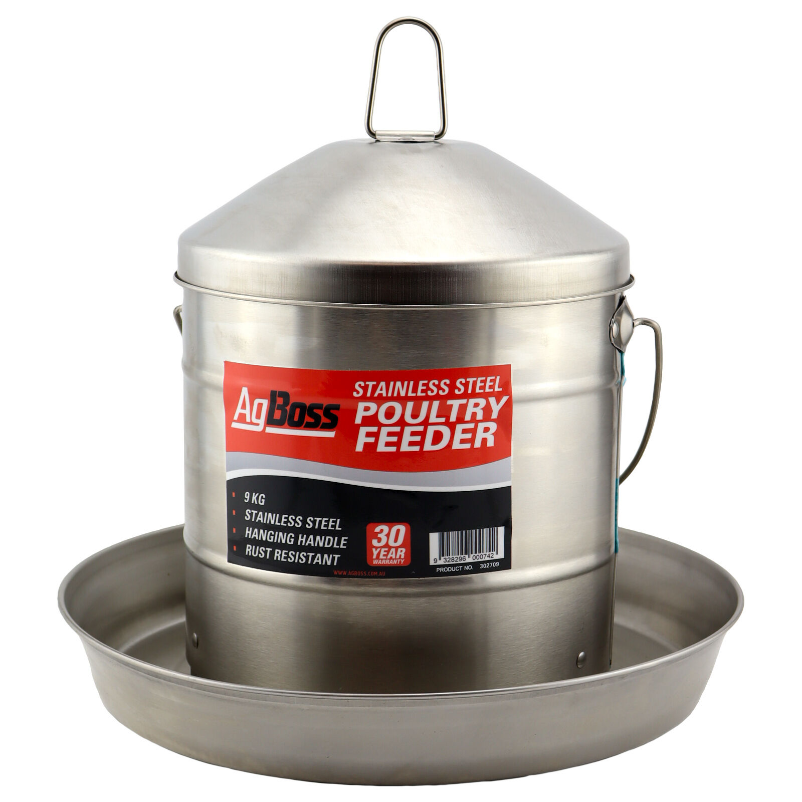Robust, top-quality, stainless poultry feeder with hanging handle from AgBoss. Made of stainless steel for extra-long life and durability. Includes a handle for hanging.