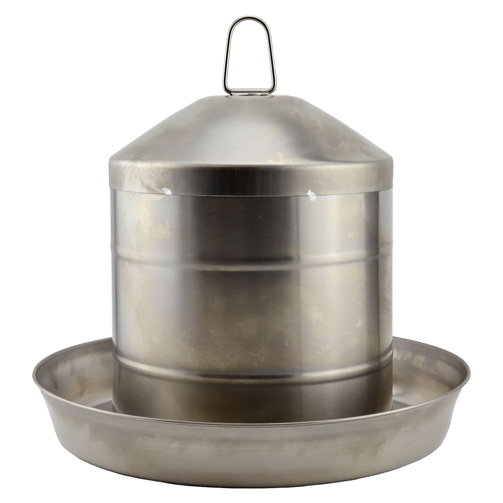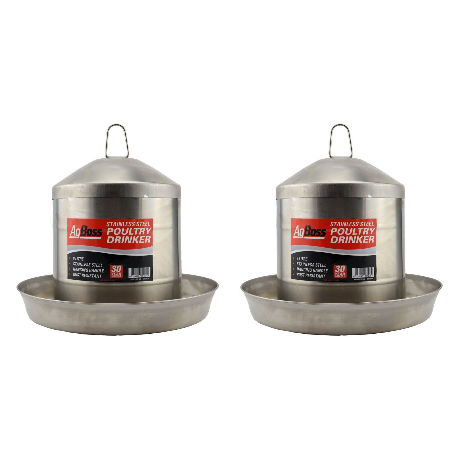Robust, top-quality, stainless steel poultry drinker with hanging handle from AgBoss.