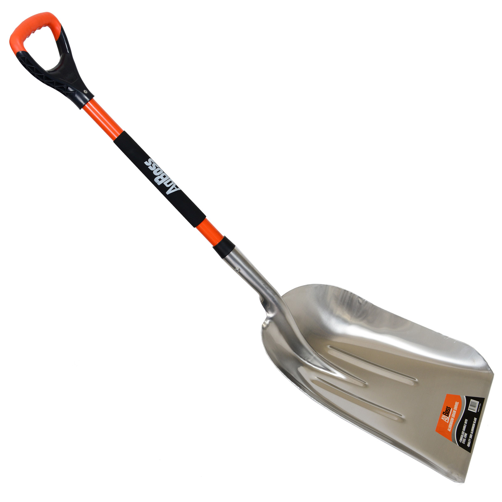 A strong aluminum grain shovel with a fiberglass D-handle.