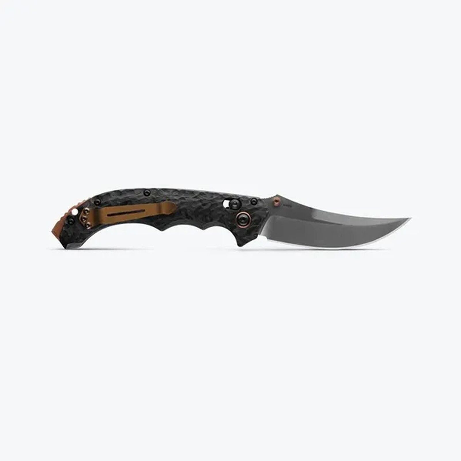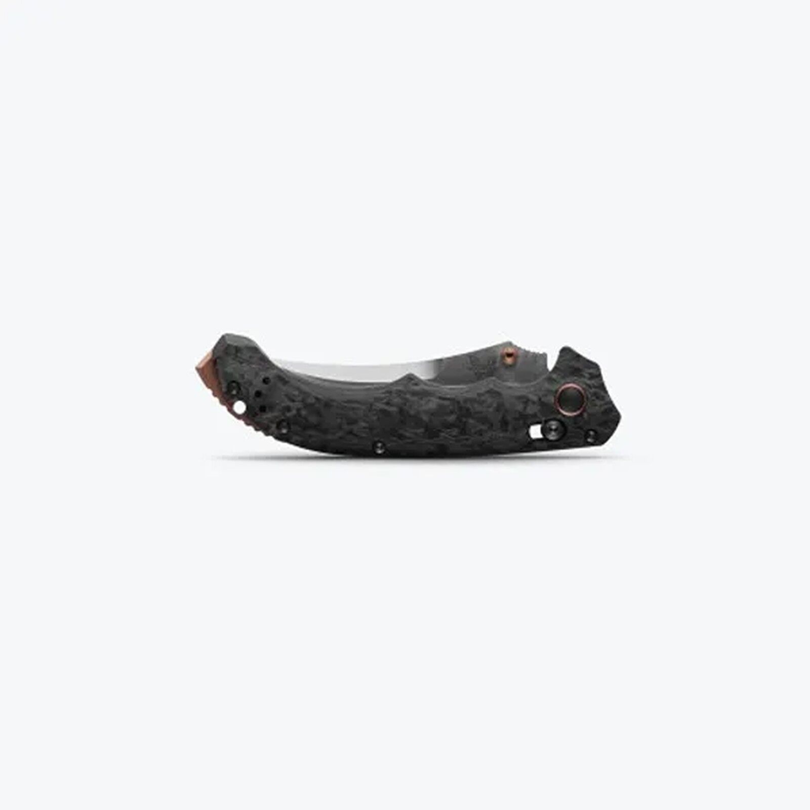 Discover the Benchmade Mini Bedlam AXIS Lock Scimitar Folding Knife, a compact powerhouse that masterfully blends tactical ferocity with sophisticated refinement, now in an everyday carry-friendly size. This isn't just a cutting tool; it's a statement of precision engineering and distinctive style, offered by The Grit for those who demand superior performance and unmistakable character. At its core, the striking upswept scimitar blade, crafted from premium CPM-S90V super stainless steel with a sleek satin finish, offers exceptional edge retention and formidable cutting prowess. Perfectly engineered for precise hooking and effortless slicing, this blade is a testament to cutting-edge performance, ready for any task you encounter. The handle is a masterclass in ergonomic design and aesthetic appeal, fashioned from exquisite marbled carbon fibre. Its aggressively textured surface flows seamlessly with the handle's curvature, providing an unwavering, superior grip that instils confidence through quick, intricate movements and bigger cutting challenges alike. Every detail contributes to its distinctive character, from the robust black oxide and dark copper PVD hardware to the chamfered copper PVD backspacer, all converging to create an unpredictable, almost reptilian allure. The renowned AXIS Lock mechanism ensures smooth, ambidextrous operation and uncompromising security, making deployment and storage both effortless and reliable. Built with pride in the USA, the Mini Bedlam is more than a knife; it’s a reliable companion designed to perform when it matters most, reflecting a commitment to quality that discerning users will truly appreciate.
