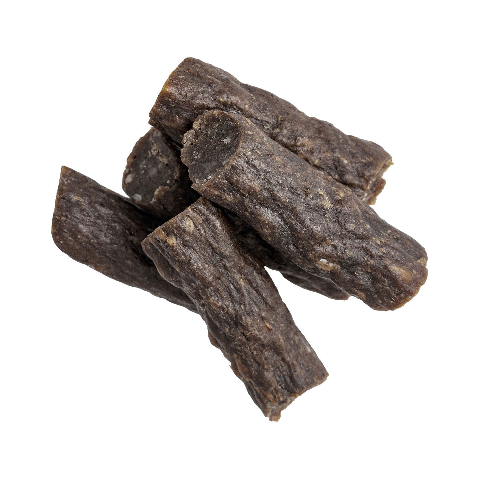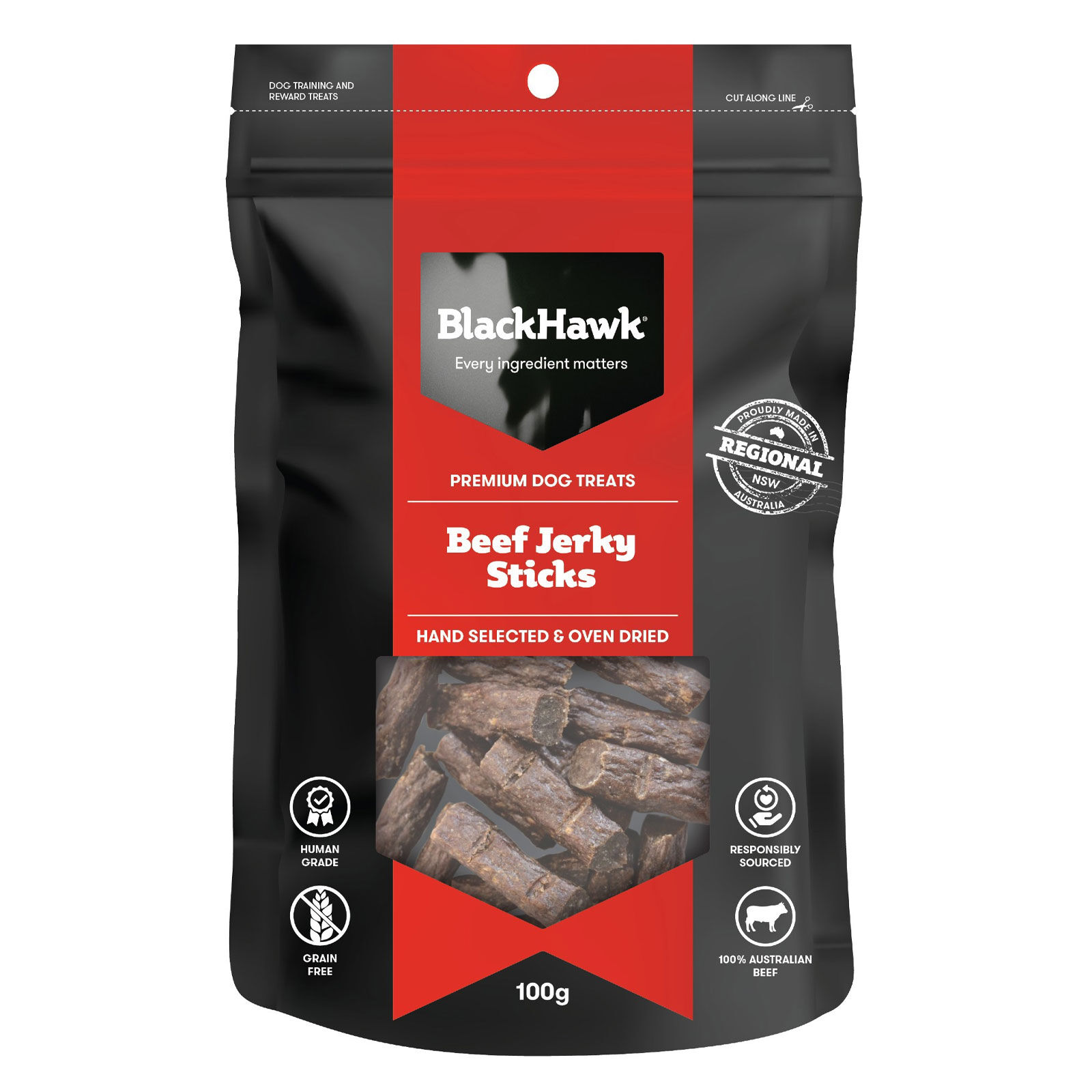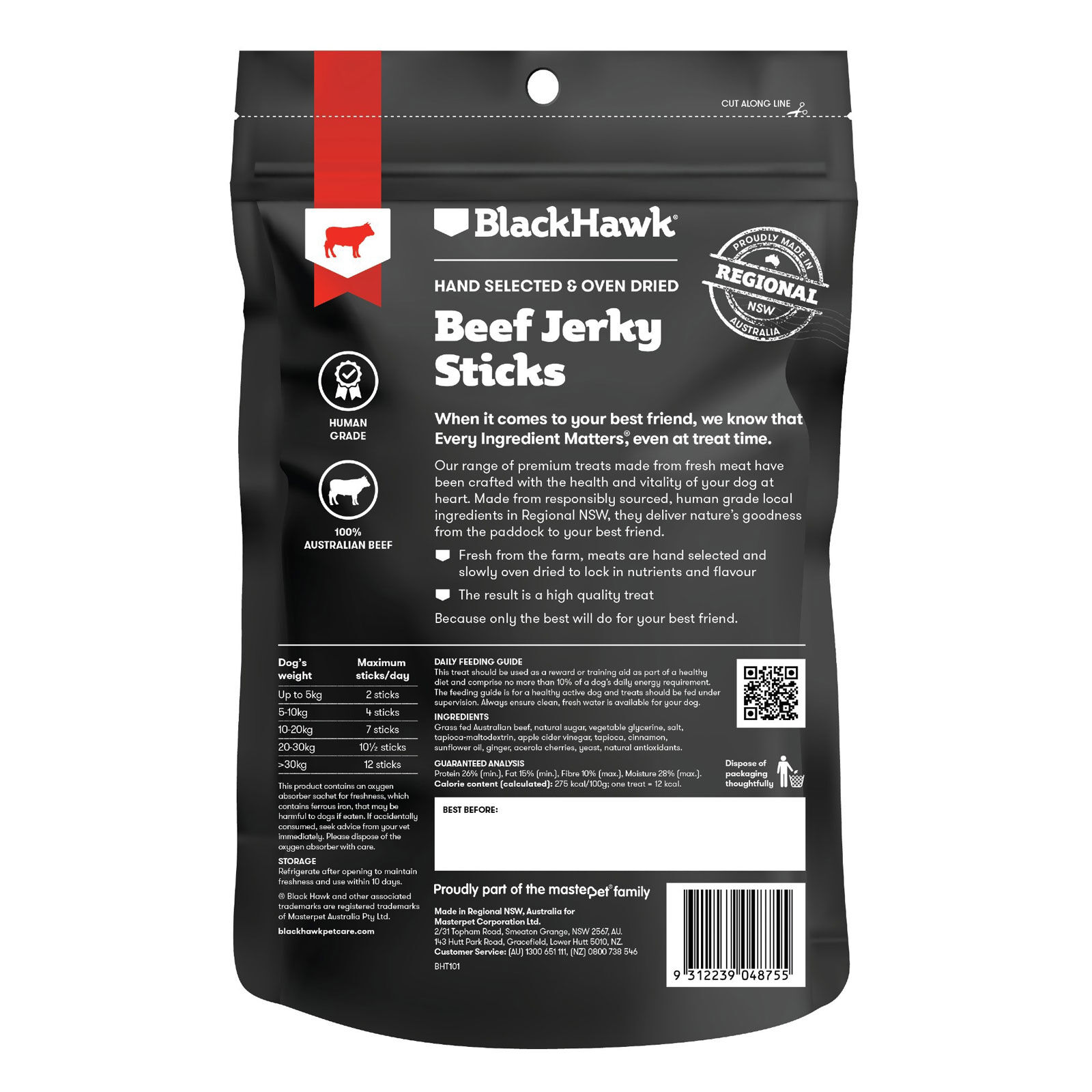 Treat your best mate to a genuine taste of the Australian paddock with Black Hawk Beef Jerky Sticks. We've sourced these exceptional treats because they embody everything we love about local, high-quality production. Each 100g pack is filled with jerky crafted in regional Australia from 100% Australian, human-grade beef, all responsibly sourced from local farms. The real difference is in the preparation; prime, grass-fed cuts are carefully hand-selected and then slowly oven-dried to perfection. This meticulous process locks in the rich, meaty flavour and vital nutrients, ensuring your dog gets a reward that is as wholesome as it is delicious. The completely grain-free recipe is enhanced with a thoughtful blend of natural ingredients like vegetable glycerine for a satisfyingly chewy texture, apple cider vinegar, and a subtle hint of cinnamon and ginger. Sized at approximately 40mm long and 8-10mm thick, these sticks are the ideal satisfying chew for small to medium dogs over twelve months old. Just like the finest jerky made for people, these all-natural treats are so fresh they should be stored in the refrigerator once opened and enjoyed within ten days to maintain their premium quality and incredible taste.