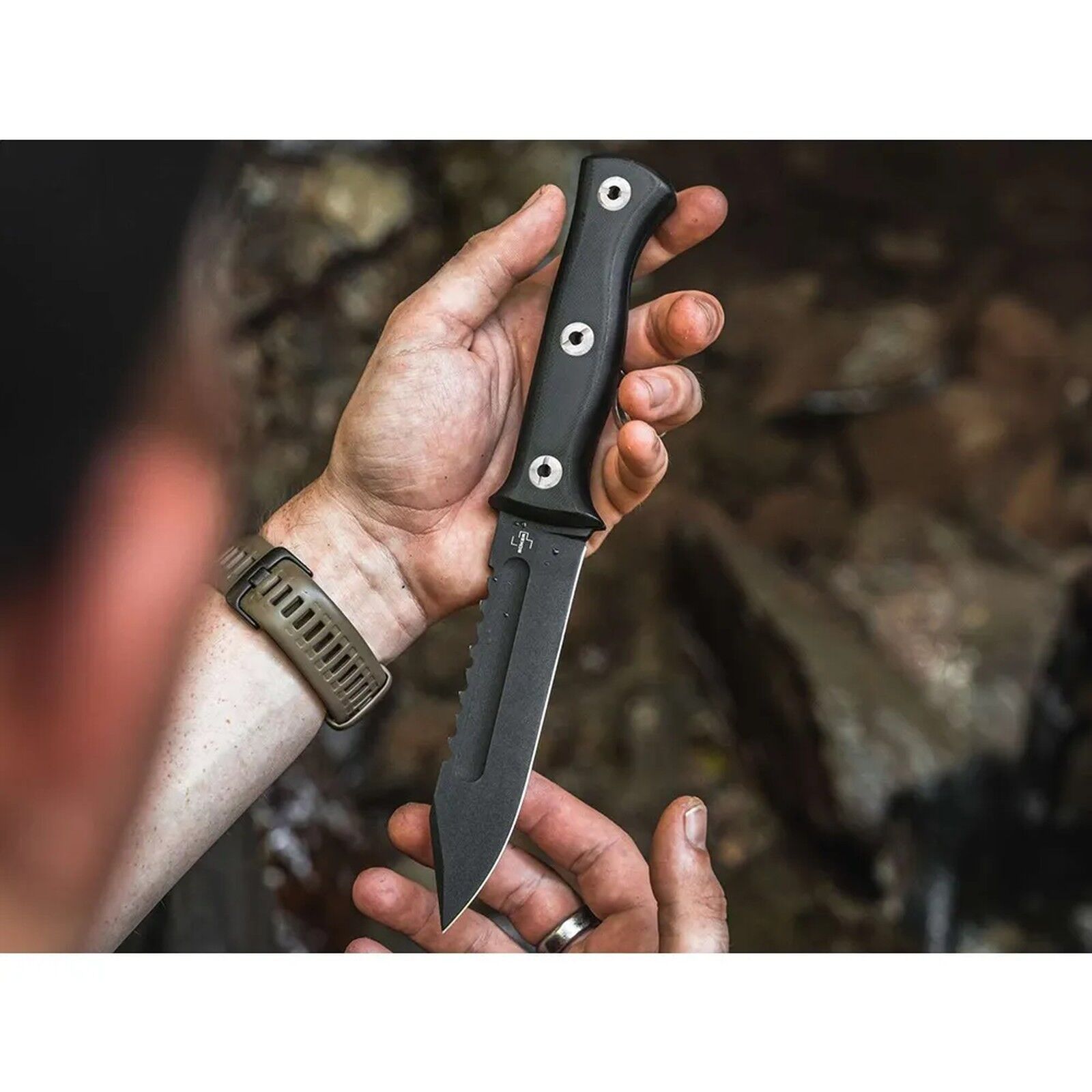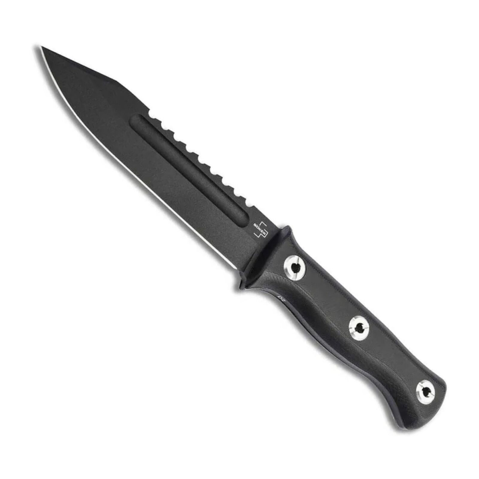 Unleash your potential in the wild with The Grit's Boker Plus Pilot Knife 2.0 Fixed Blade in Black, a powerhouse outdoor and survival knife expertly crafted by U.S. knifemaker Dave Wenger. This formidable tool embodies a distinct tactical orientation, ready to tackle the most demanding environments. At its core is a massive D2 steel blade, renowned for its exceptionally high edge retention and inherent robustness, all while being shielded by an abrasion-resistant powder coating for enduring performance. Its military character is clearly defined by the dual-sided hollow groove and the unmistakable sawback, making a statement of resilience. The ergonomic G10 handle scales are engineered to provide a supremely comfortable and secure grip, ensuring unwavering control no matter the conditions, with this updated version featuring sturdy screws for its full tang construction. Complete with a custom-fit Kydex sheath and a reliable belt clip, the Boker Plus Pilot Knife 2.0 is the definitive companion for those who demand uncompromising reliability and performance when facing the unknown.
