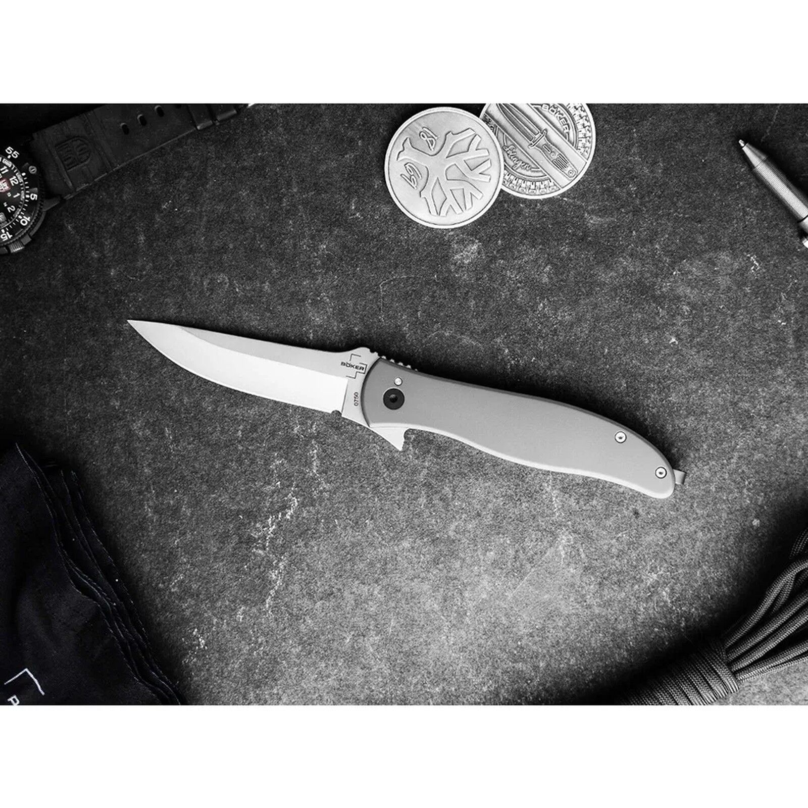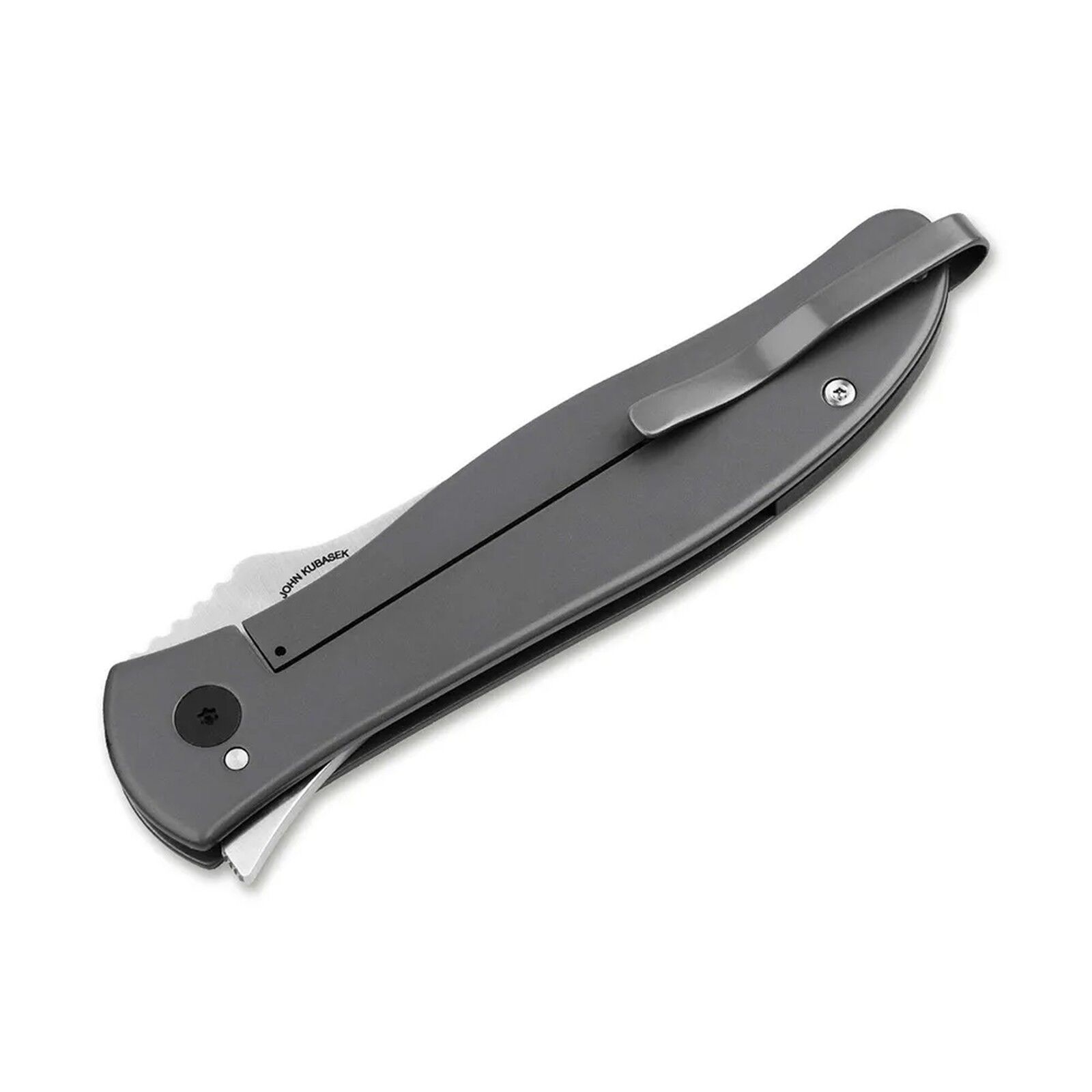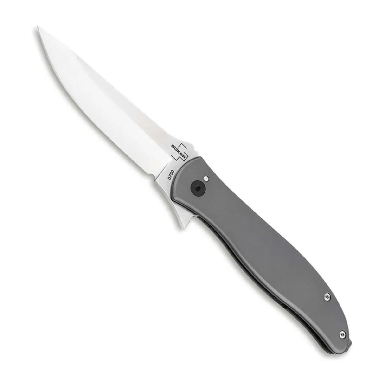 Discover the Boker Plus The Escort, a folding knife that perfectly balances understated style with uncompromising capability. Master knifemaker John Kubasek envisioned this exclusive everyday companion, engineered to make light work of any task. The satin-finished Nitro-V straight back blade glides into action effortlessly thanks to its ball bearing pivot, always prepared for whatever comes your way. Security is paramount, with a robust framelock consistently protecting the blade. You'll appreciate the exceptional feel and assured grip provided by the pronounced jimpings on the thumb ramp and the gently curved silhouette of the grey stainless steel handle, ensuring high safety during use. Its tip-up clip allows for discreet, deep pocket carry, complemented by a sleek black pivot screw reminiscent of classic bodyguard sunglasses. This reliable tool is supplied with a high-quality nylon case for convenient storage. The Boker Plus Escort truly is the ideal companion, ready when it matters most.