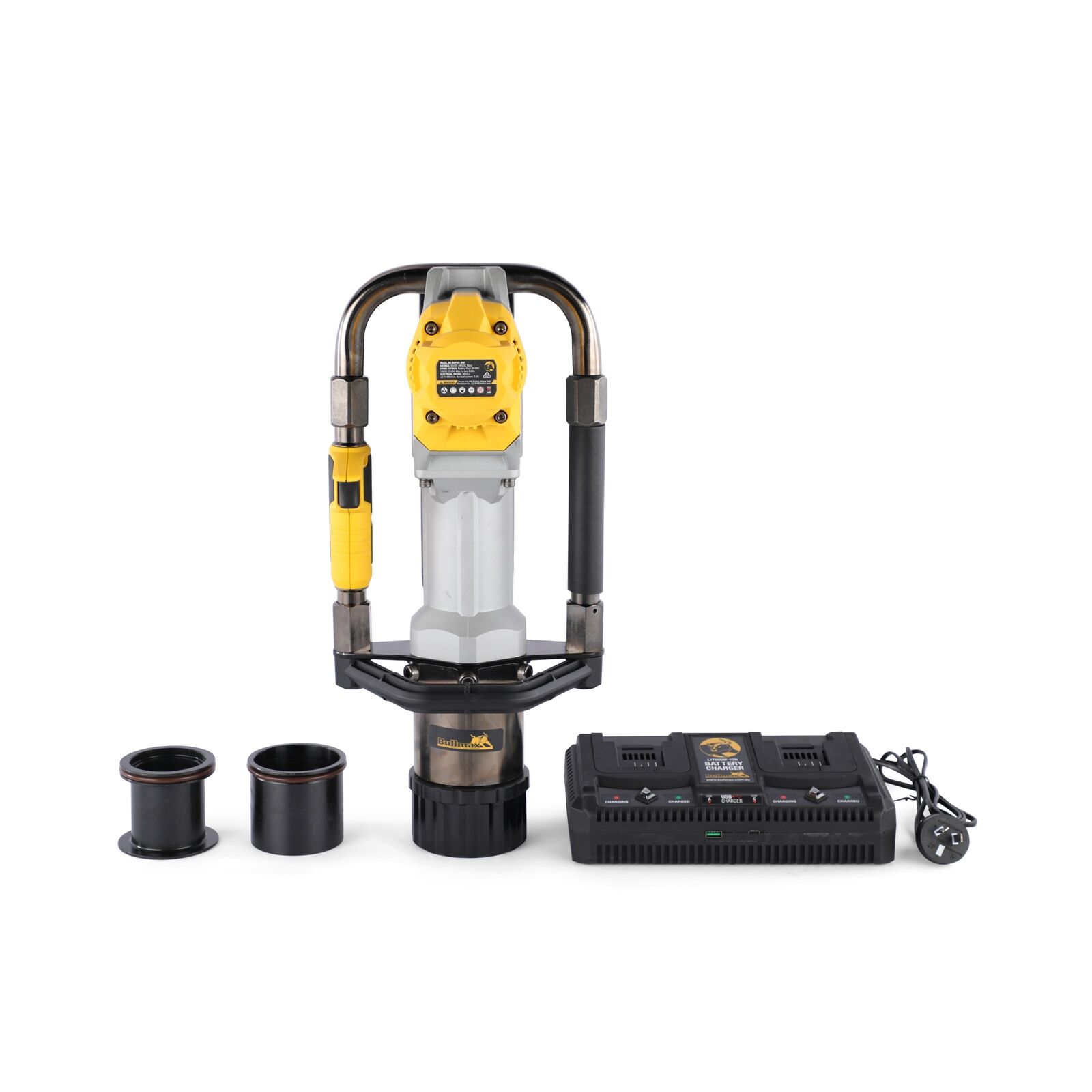 Unleash unparalleled efficiency and power on your worksite with The Grit's Bullmax 2 Piece 36V 8.0Ah Post Driver Bull Charge Kit, engineered for serious performance. This robust 36V post driver, featuring a potent 750W brushless motor, delivers the grunt needed to tackle demanding fencing, farm, and construction tasks with remarkable ease. Forget the fatigue; weighing in at a mere 13.9kg, and up to 25% lighter than comparable models, this unit is designed for extended use without compromising on brute force. The innovative Bull Charge system ensures you stay productive, boasting the capacity to drive an impressive 120 posts on a single charge thanks to its dual 8.0Ah lithium batteries, which are quickly recharged via the included double fast charger. Its incredible versatility is a standout feature, accommodating a vast array of post types with its interchangeable sleeve heads: the 55mm adaptor handles standard star pickets, while the 75mm adaptor and 80mm post-guide housing confidently manage larger posts like MAXI posts, AG POST MEGA, 50mm x 50mm timber, and even substantial pipe up to 65NB. Built tough and designed in Australia for our demanding conditions, this kit comes complete with a custom carry case, ensuring your investment is protected and portable, ready for any job, anywhere. Backed by a Bullmax 1-year warranty, this Post Driver Bull Charge Kit is the ultimate solution for professionals seeking uncompromising power, reliability, and efficiency in their post-driving operations.