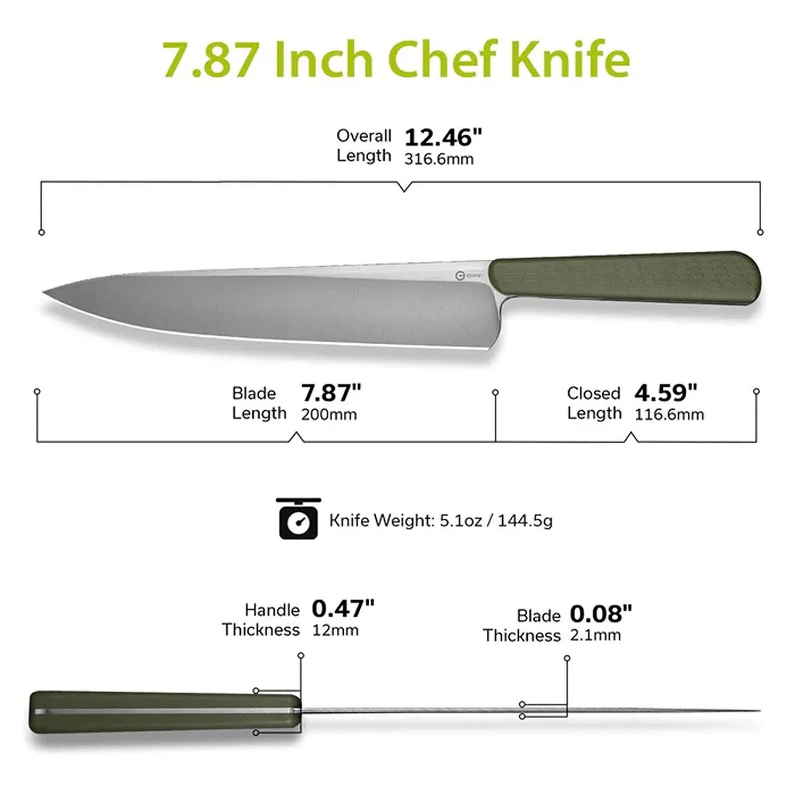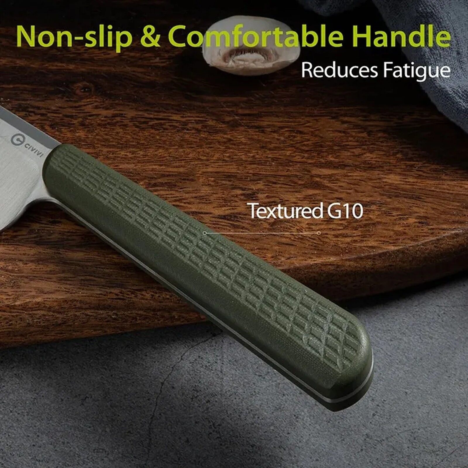The CIVIVI Cibus Chefs Knife in Green and Satin marks a confident entry into the culinary world, masterfully designed by Ostap Hel to bring precision and modern style to any kitchen. This Asian-inspired chef's knife effortlessly handles slicing, dicing, and chopping, proving itself indispensable for both home cooks and professionals. Its Sandvik 14C28N stainless steel blade boasts a fine satin finish and a thin stock, ensuring razor-sharp performance and outstanding edge retention. The drop point profile and full flat grind guarantee clean, precise cuts through all your ingredients. Complementing its superior blade, the lightweight yet robust green G10 handle offers a comfortable, ergonomic grip, providing superb control during even the longest prep sessions. Weighing in at approximately 145 grams, the Cibus is remarkably agile and perfectly balanced, making it your go-to tool for every kitchen task. From delicate herbs to tougher cuts of meat, this knife redefines what a high-performance culinary blade can deliver, showcasing CIVIVI’s dedication to exceptional craftsmanship.