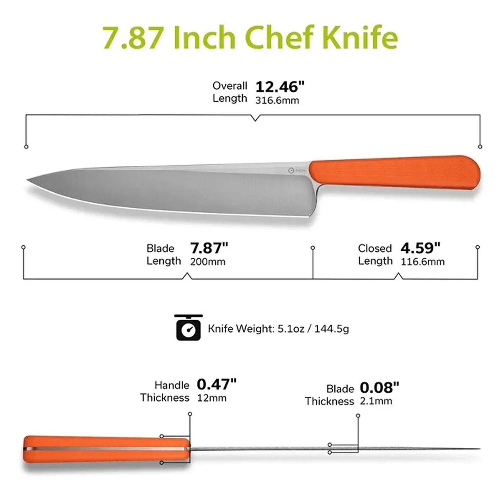 Introducing the CIVIVI Cibus Chef's Knife in a striking Orange and Satin finish, a bold new venture from CIVIVI Knives and designer Ostap Hel, bringing their renowned precision and craftsmanship directly into your kitchen. This Asian-inspired chef's knife marks a significant step, masterfully blending modern aesthetics with unparalleled versatility for both professional and home culinary enthusiasts. Engineered for effortless control, it excels across all your slicing, dicing, and chopping tasks. The Sandvik 14C28N stainless steel blade boasts a pristine satin finish and a slender profile, delivering razor-sharp performance with exceptional edge retention, while its drop point and full flat grind ensure consistently clean, precise cuts through any ingredient. Complementing this superior blade is a lightweight yet incredibly durable orange G10 handle, ergonomically shaped to provide a comfortable, secure grip and superb handling during even the most extended prep sessions. Weighing in at just over 145 grams, the CIVIVI Cibus is remarkably agile and perfectly balanced, making it an indispensable tool for everything from delicate herb preparation to tackling robust proteins. This knife redefines expectations for a high-performance culinary blade, proving CIVIVI’s dedication to quality extends far beyond the pocket and directly into the heart of your cooking.