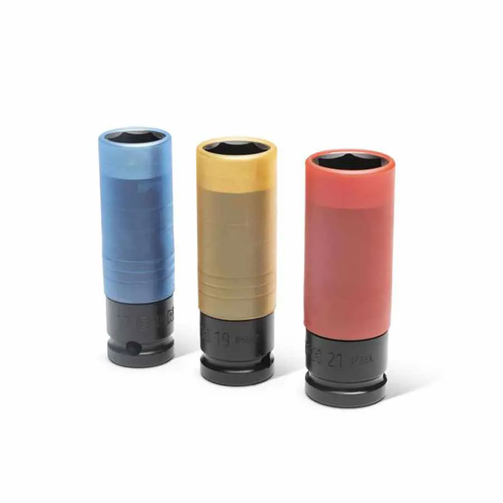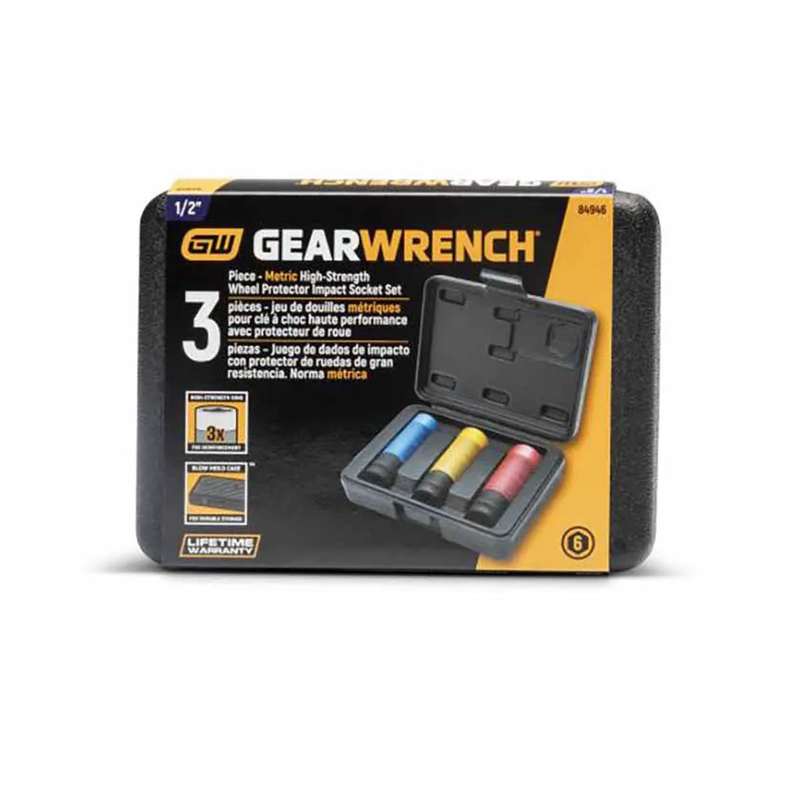 Protect your valuable alloy wheels with the GearWrench 3-piece 1/2 inch Drive Wheel Protector Impact Socket Set, a professional-grade kit available at The Grit. This essential set is specifically designed to prevent the scratching and marring of expensive wheels during tyre changes and servicing. Each of the high-strength sockets is encased in a protective outer sheath that safely contacts the wheel's lug nut recess, while a special internal insert protects the faces of the lug nuts and bolts from damage. Despite this protective layer, they feature a thin-wall design for easy access in confined spaces. Engineered for exceptional strength and up to three times the life of standard thin-wall impact sockets, they are crafted from chrome molybdenum alloy steel. A manganese phosphate coating provides superior corrosion resistance. This set includes the three most common metric sizes—17mm, 19mm, and 21mm—all with highly visible laser-etched markings and housed in a durable blow-mould case for easy storage and transport.