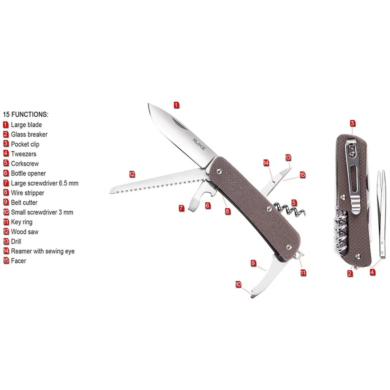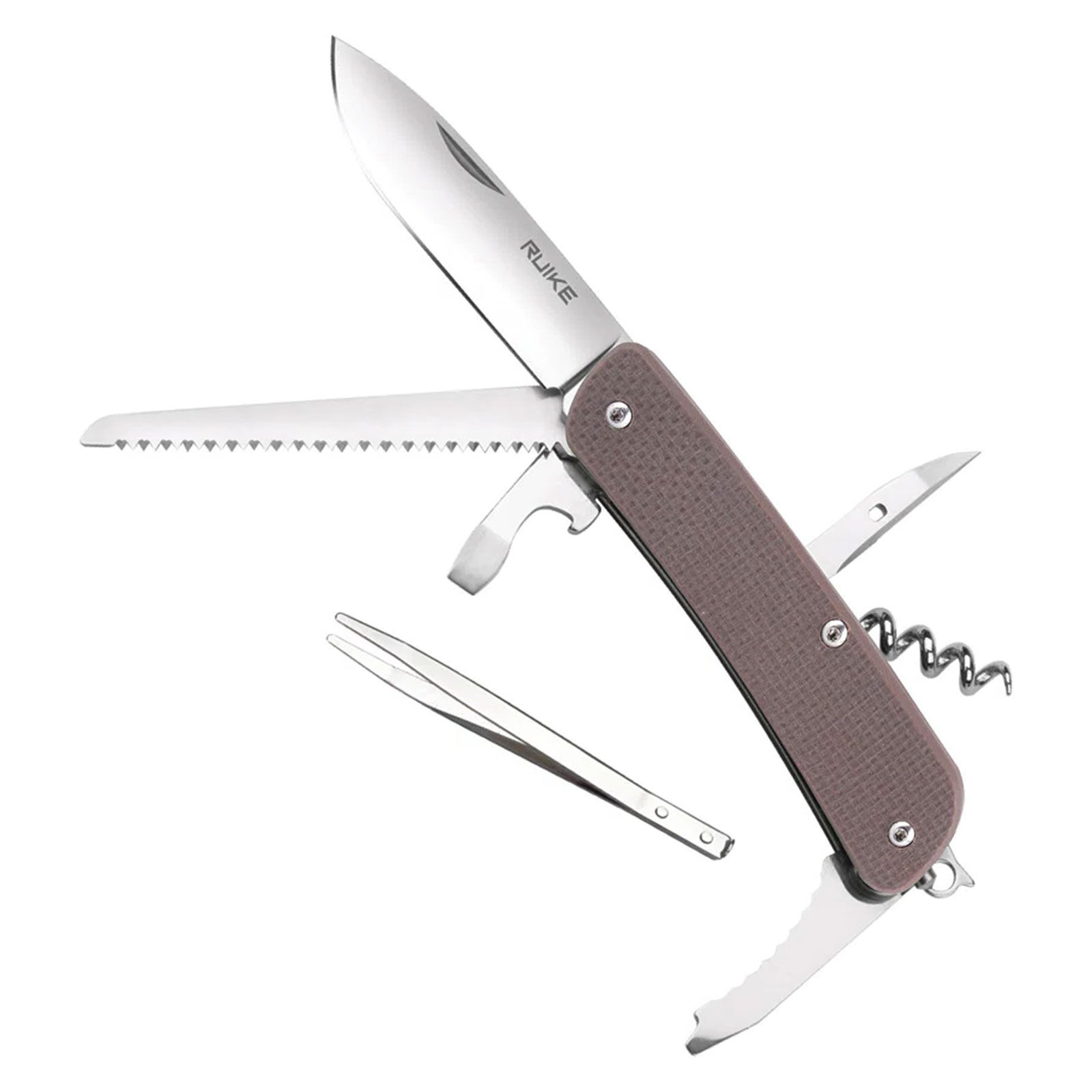 The Ruike M32-N is a seriously capable folding knife, built to handle a surprising number of tasks wherever your day takes you. Compact enough for everyday carry – easily clipped to your pocket or added to your keyring – this knife doesn’t compromise on functionality. The 76mm blade is crafted from durable Sandvik 12C27 stainless steel, known for its strength, resistance to rust, and ability to hold a sharp edge. A robust brown G10 handle provides a secure and comfortable grip, standing up to tough conditions and general wear and tear. Beyond the blade, you’ll find a useful toolkit integrated into the handle, including a glass breaker, tweezers, corkscrew, a selection of screwdrivers (3mm and 6.5mm), a wire stripper, belt cutter, small saw, drill/reamer with a sewing eye, and even a bottle opener. It’s a practical and reliable companion for anyone who appreciates being prepared.
