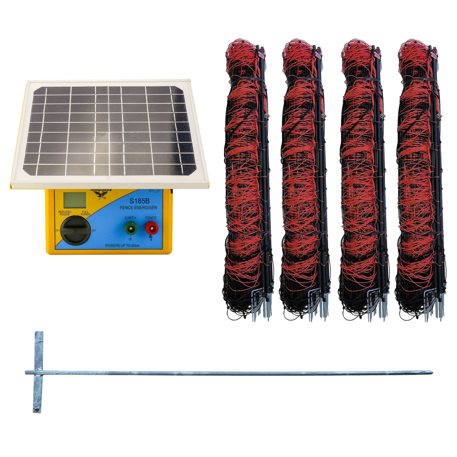 Secure your livestock and take full control of your pasture management with this comprehensive Thunderbird electric fencing package. This system provides a total of 200 metres of premium sheep, goat, and calf netting, standing at a practical height of 108 centimetres to effectively contain your animals. Deployment is incredibly fast—the four 50-metre sections can be set up in minutes thanks to the integrated, double-pronged tread-in posts that ensure exceptional stability on uneven ground. Designed for reliability, the netting features ten horizontal stainless-steel conductors and robust vertical struts to prevent sagging, while a cleverly non-electrified bottom wire minimises power loss from contact with grass. At the heart of this setup is the powerful Australian-made Thunderbird S-185B solar energiser, engineered to perform in the toughest local conditions. Its intelligent battery management software automatically adjusts the 7,400-volt output based on solar conditions, ensuring consistent performance and preserving battery life. You can easily monitor fence voltage and battery status on the clear digital screen. This highly portable unit is housed in a tough, O-ring sealed enclosure and includes a mains charger for backup during extended overcast periods. Supplied as a complete, ready-to-go kit with the 200 metres of netting, the 20km solar energiser, and a one-metre earthing stake, this is the practical and powerful solution for rotational grazing and securing your valuable stock across larger properties.